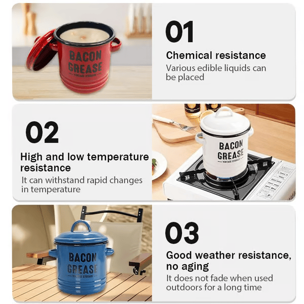Portable use: The double-ear design is easy to carry, the high-temperature resistant enamel grease container and the detachable filter are made of food-grade 304 stainless steel, and can be used as a pot outdoors for cooking competitions
